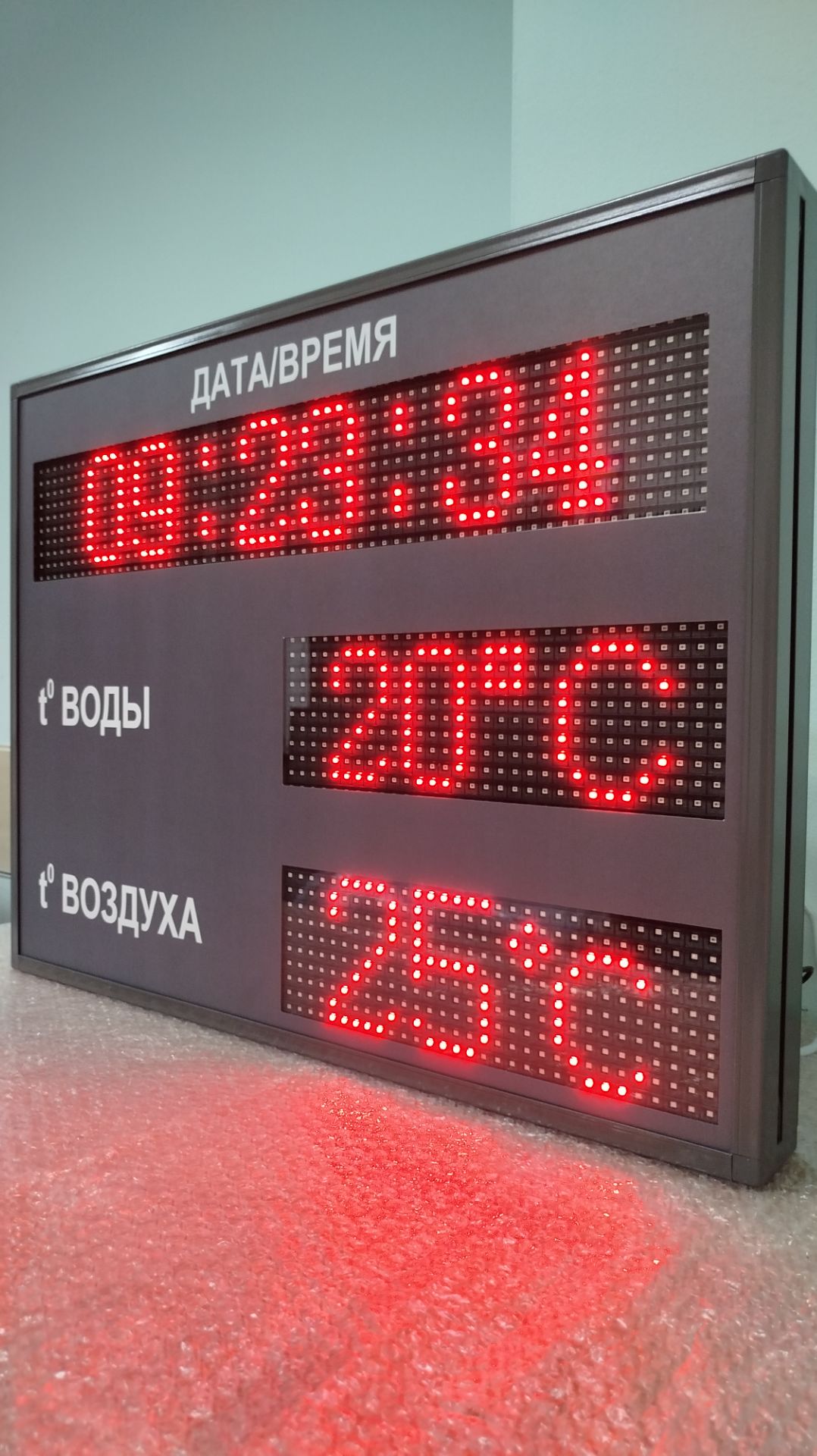 Информационные табло предназначено для установки как внутри помещений (бассейнов, саун), так и вне зданий (пляжей, горячих источников). Табло отображает текущее время, а также показатели температуры окружающей среды и воды.